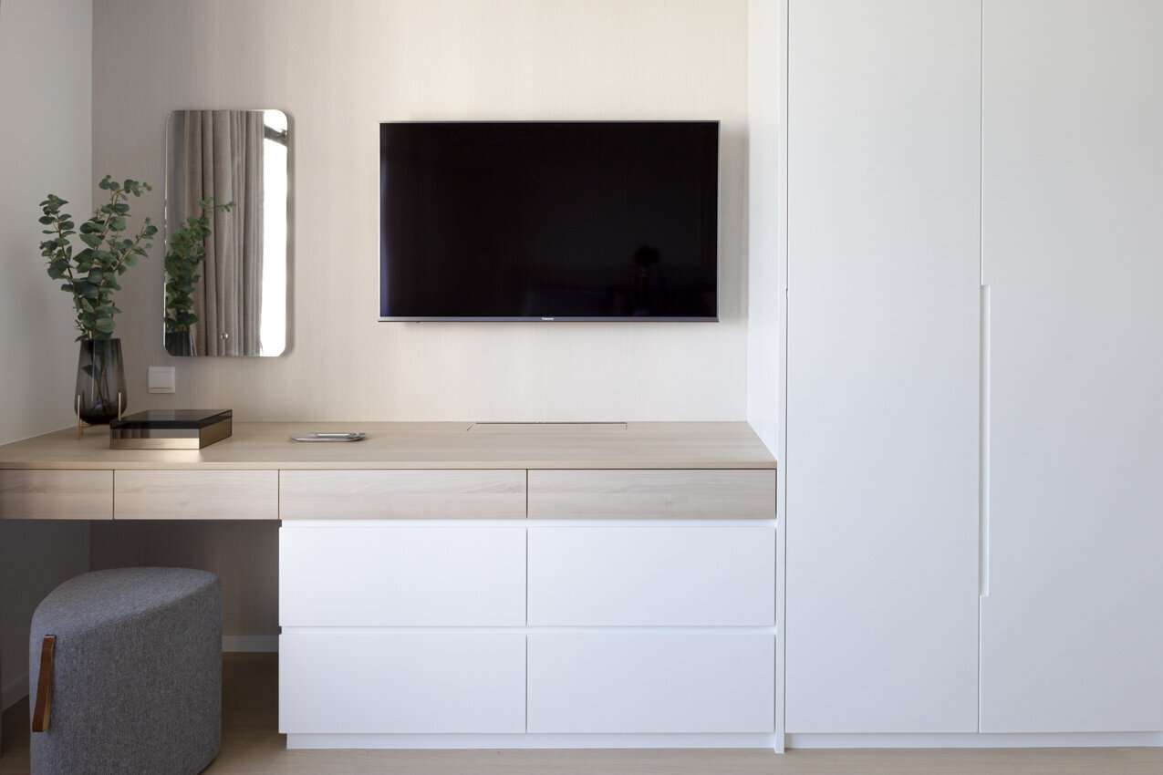 這次的設計單位戶主是兩位回流的年輕夫婦,他們偏愛以大地色系為主調 配以簡約自然的設計,亦希望將室外宜人的山景引入屋內,因此設計師所選的物料及傢俱相對天然。此外設計師刻意在大廳設計了一幅雲石特色牆,點綴了這個溫暖舒適的單位 增添另一份時尚感。